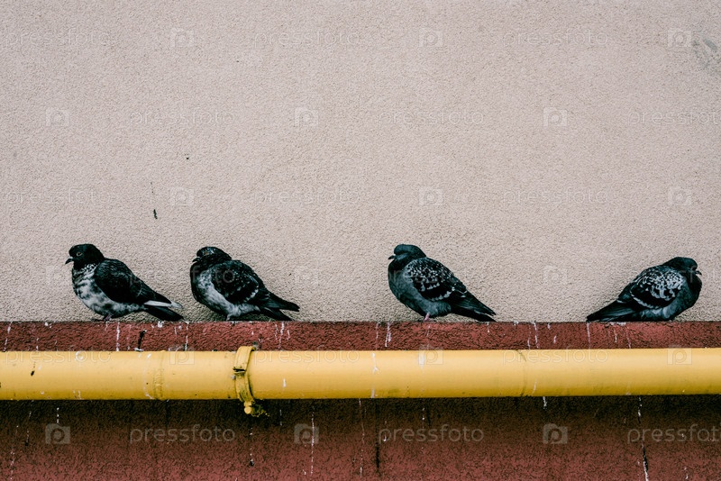 Дикий серый голубь сидит на желтой газовой трубе возле многоквартирного дома