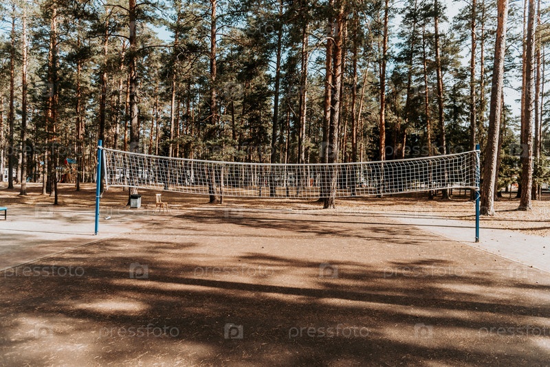 Детская волейбольная площадка для детей в парке соснового леса, панорама на пасмурный летний день