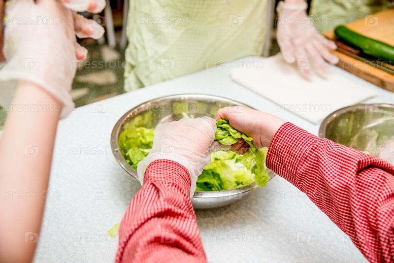 Шеф-повар в ресторане на кухне готовит овощный салат, ближайшие руки режут помидоры и огурцы на доске для обрезания