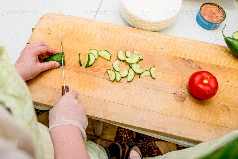 Шеф-повар в ресторане на кухне готовит овощный салат, ближайшие руки режут помидоры и огурцы на доске для обрезания