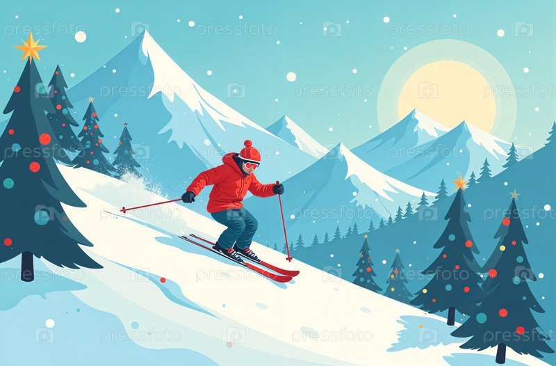 Созданный ИИ Человек катится по снежной горе на лыжах, горы и рождественская елка на заднем плане, новогодние праздники в горнолыжном курорте