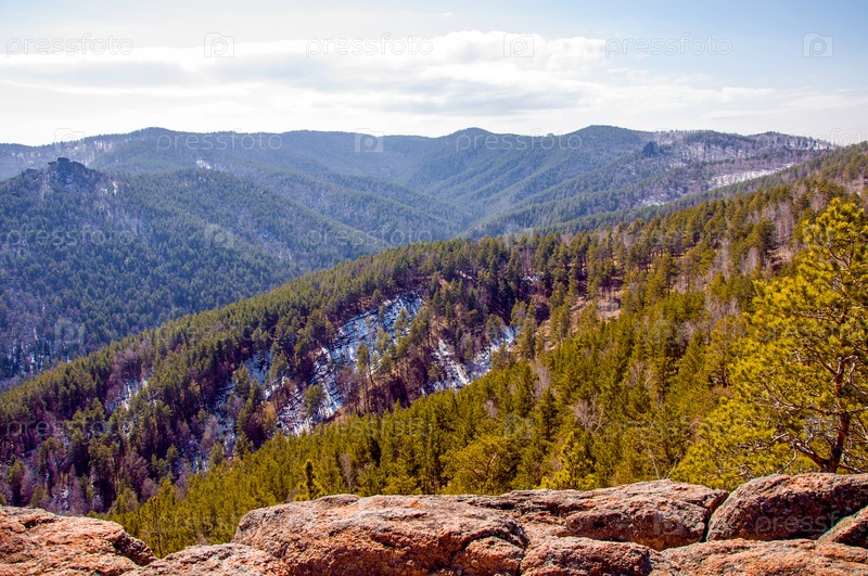 Пейзаж заснеженной Сибири Красноярские горы, горный хребет в туманное лето