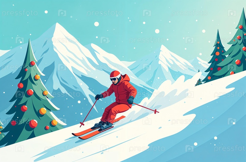 Созданный ИИ Человек катится по снежной горе на лыжах, горы и рождественская елка на заднем плане, новогодние праздники в горнолыжном курорте