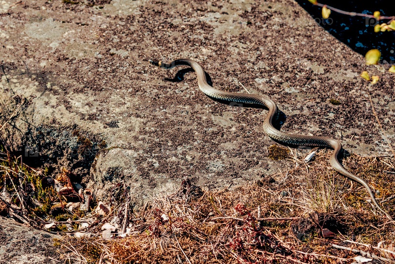 Общая неядовитая змея ползает по лесным лесам, наблюдая за средой обитания рептилий