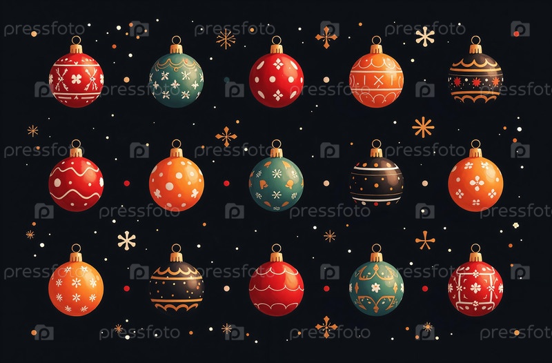 Новогодние открытки, рождественские шары и снежинки на цветном фоне