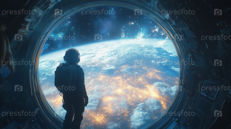 Астронавт смотрит на Землю из окна космического корабля