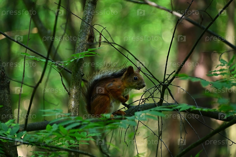 Милая белка сидит на ветке дерева в летнем лесу