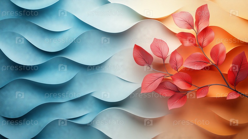 Красные листья ветки на абстрактном сине-оранжевом фоне волн