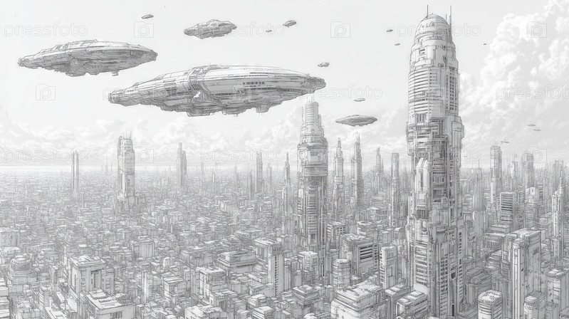 Футуристический город с высокими небоскребами и огромными космическими кораблями