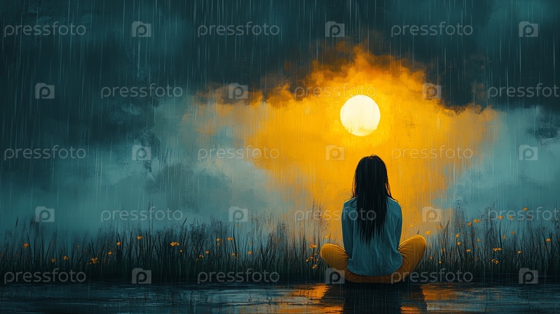 Женщина, сидящая под дождем, смотрит на сияющее солнце сквозь грозовые облака