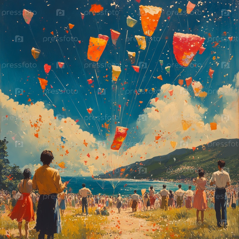 Красочный фестиваль воздушных змеев у моря в солнечный день