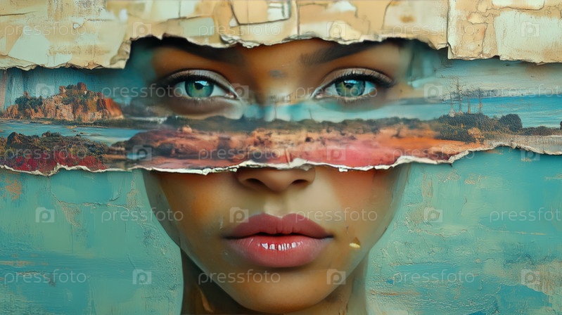 Сюрреалистический портрет женщины с морским пейзажем и трещинами краски