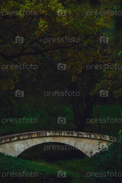 Каменный мост в пышно-зеленом лесу осенью