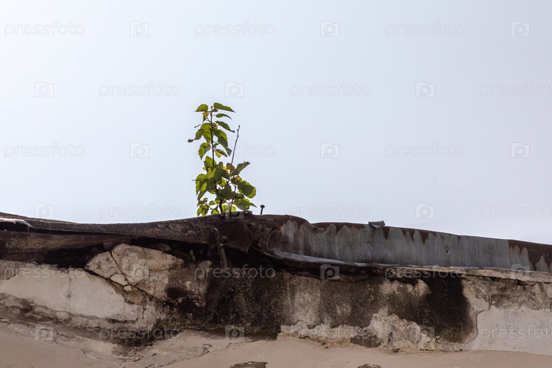 Молодое дерево растет на старой крыше здания