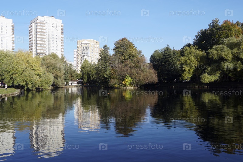 Озеро в городском парке в солнечный, безоблачный день
