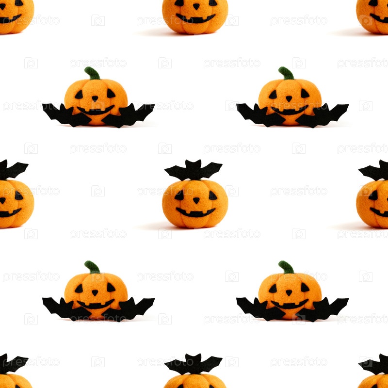 Бесшовный рисунок с шерстяной игрушечной тыквой и летучими мышами на белом фоне