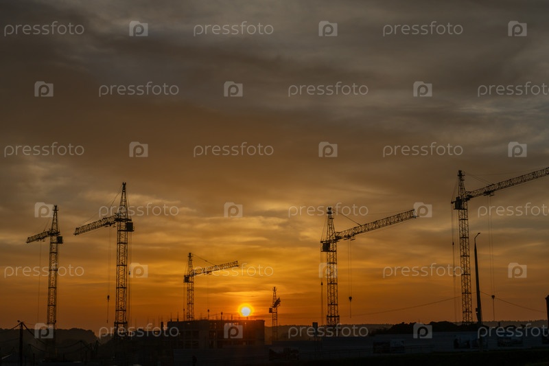 Силуэты строительных кранов на стройплощадке среди неба, освещенного восходящим солнцем на рассвете