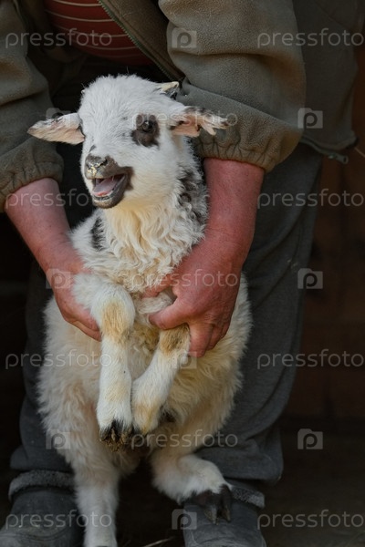 Портрет новорожденного чистокровного ягненка в напряженных руках пожилого крестьянина в горной деревне Дагестана