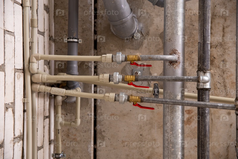 Воздушная промышленная сантехника и система отопления с сетью металлических водопроводных труб, клапанов и пластиковых дренажных линий под потолком фабрики