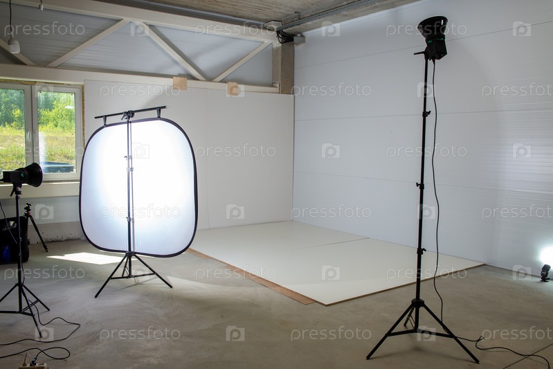 Фотозона в углу фабрики для фотографирования продукции, со студией и большим софтбоксом, создавая мягкое профессиональное освещение