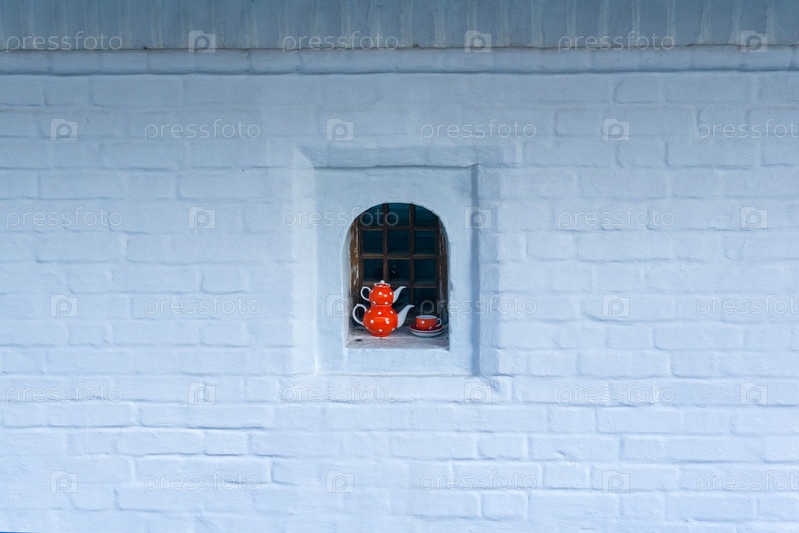 Старое окно со стаканчиком чая на кирпичной стене - это реклама винтажного чайника
