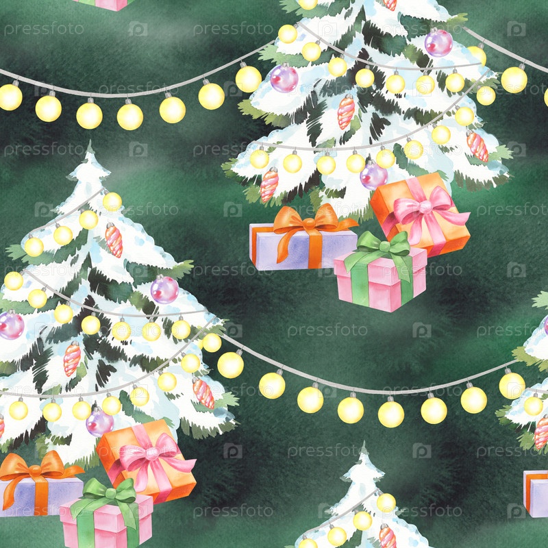 Бесшовный рисунок рождественской елки, гирлянд и подарков на зеленом фоне. для ткани, обоев, упаковочной бумаги, поздравительных открыток, дизайна, декора и иллюстрации