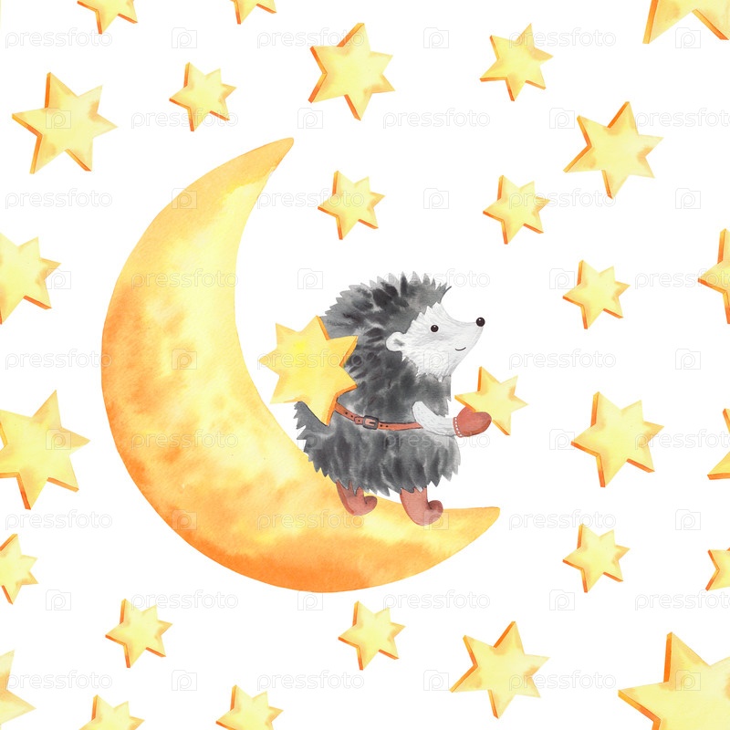 Бесшовный рисунок луны и петуха с звездами. Иллюстрация акварели. Для ткани, обоев, упаковочной бумаги, поздравительных открыток, дизайна, декора и иллюстрации