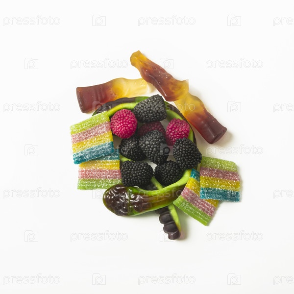 Гумонозные конфеты на белом фоне: змея, газировка, малина, радуга. изолированный. плоский мир