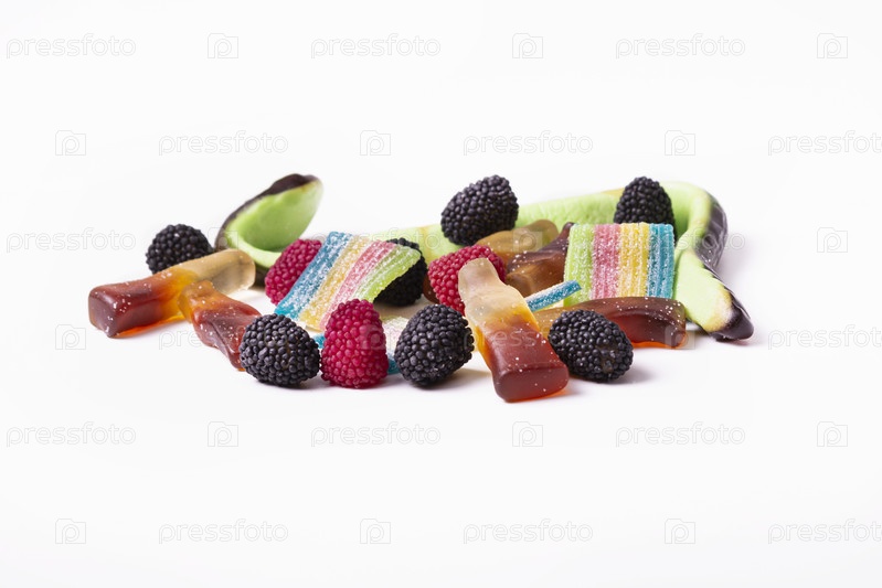 Гумонозные конфеты на белом фоне: змея, газировка, малина, радуга. изолированный