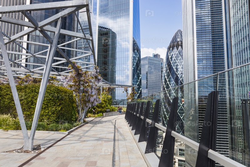 Сад на крыше дома по адресу 120 Fenchurch Street со стеклянными небоскребами, стальными рамами, отражениями и пышными приземлениями через лондонский горизонт