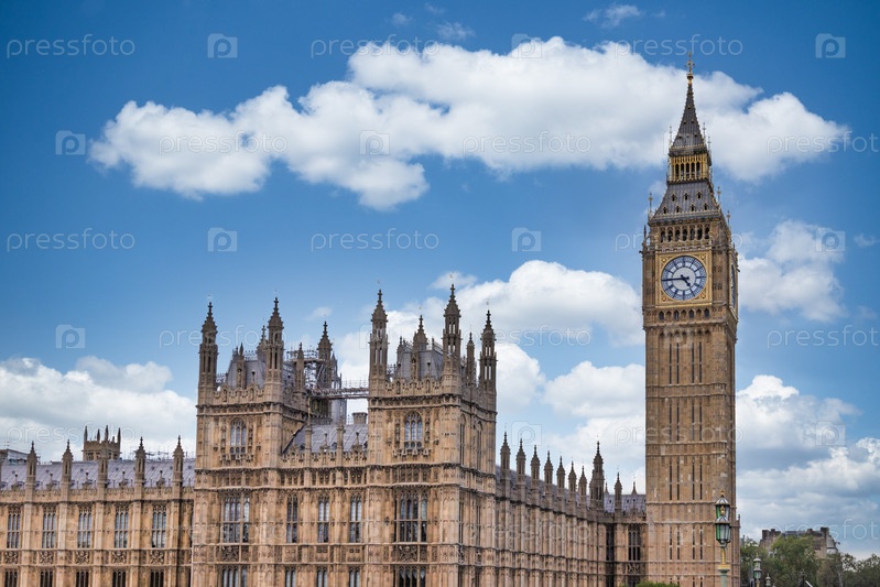 Потрясающий вид на Биг-Бен и здания парламента в Лондоне, показывающие башню Елизаветы, орнаментированную готическую архитектуру, синее небо и облака