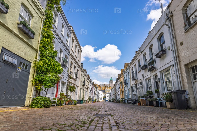 Низкоугольный вид на тихий мио Лондон, полосу мощеных камней, белые фасады и плющ под облаками