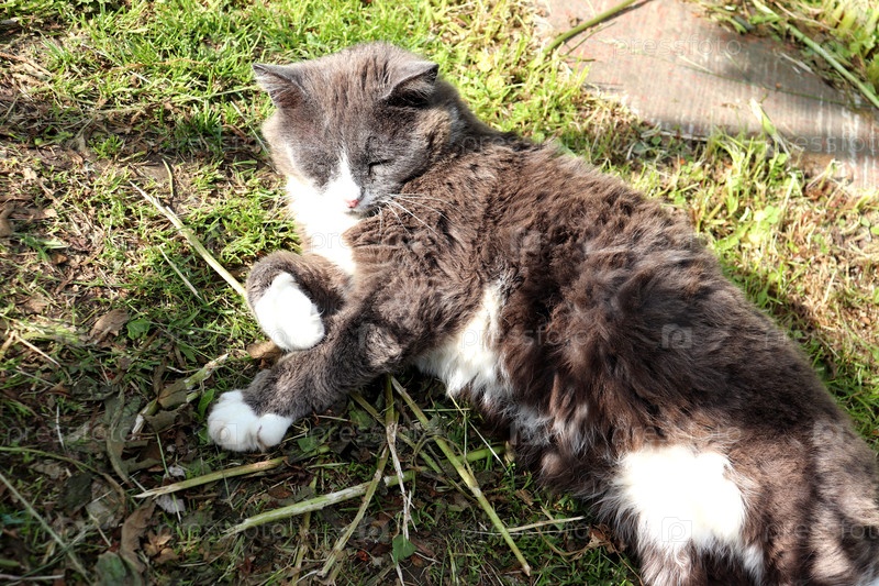 Серый кот лежит на боку, заглядывая от солнца по дорожке в саду в летний день