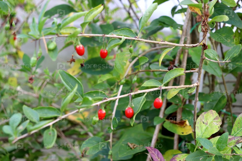 Куст с спелыми красными ягодами хуми на ветке в саду в пасмурный осенний день