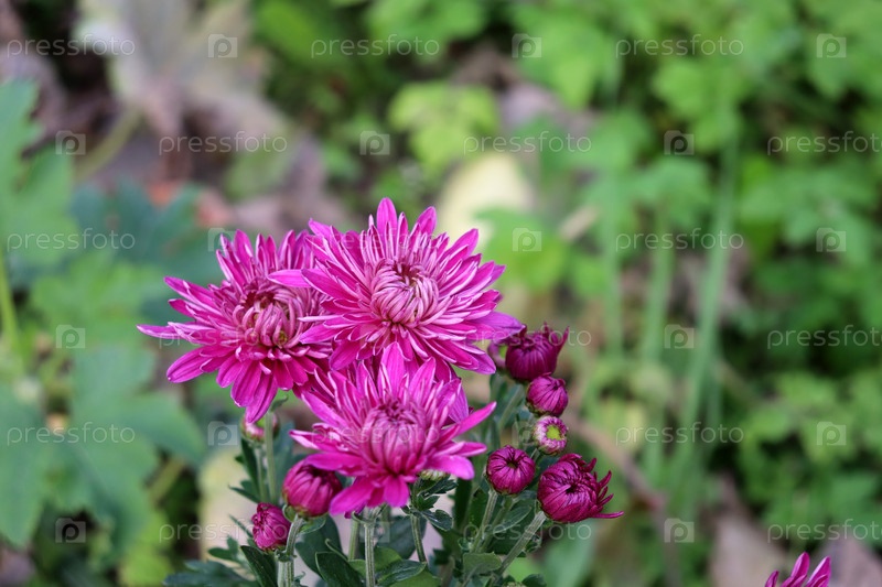 Три розовых хризантемы с почками на клумбе осенним днем в саду