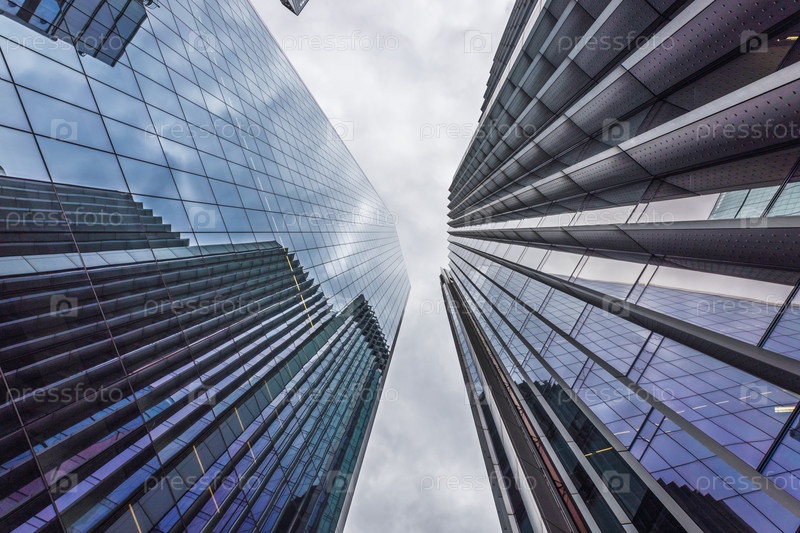 Вид на современные стеклянные небоскребы в Лондоне, отражающие небо и близлежащие здания