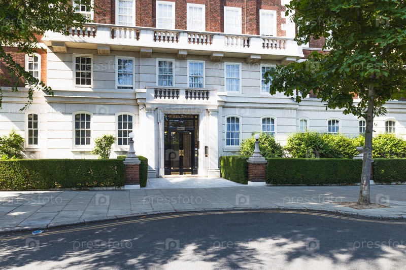 Классическое лондонское многоквартирное здание с богато украшенными деталями, белым фасадом и зелеными заборами вдоль тихой улицы