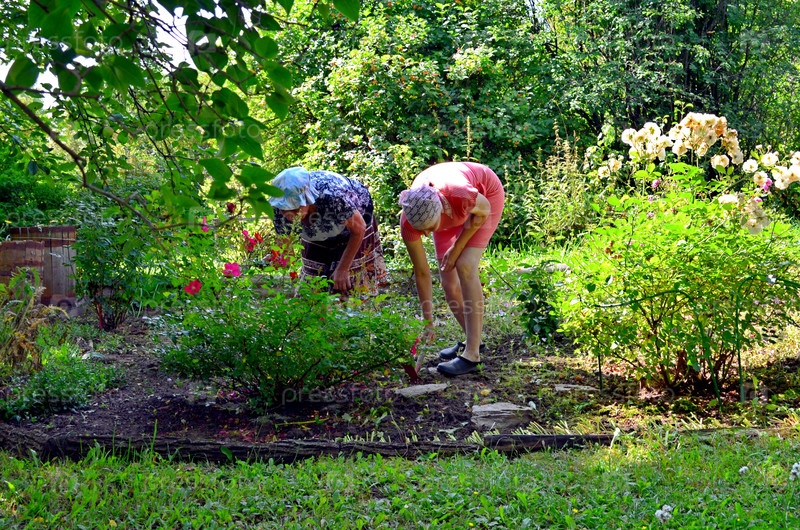 Две женщины заботятся о розовом саду.Обезвоживание и ослабление цветочного сада