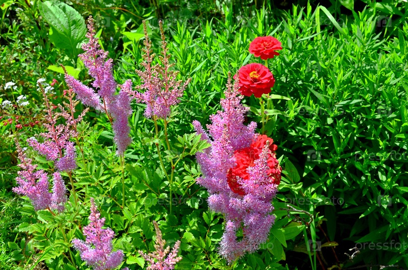 Астильба и зинния на клумбе