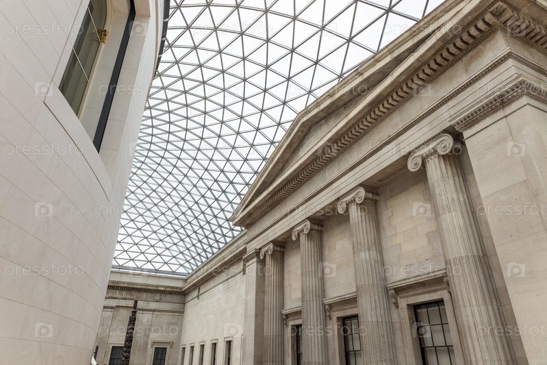 Широкий угол наблюдения Британского музея за Большим дворцом, показывающий неоклассические фасады и шикарные стеклянные крышечные решетки при светлом дневном свете в центре Лондона