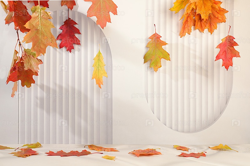 Пустая деревянная панель с кленовыми листьями на кухонном фоне, минималистская осенняя концепция, творческая осенняя композиция и баннер для отображения