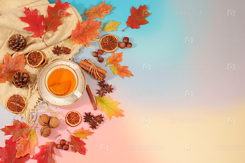 Яркий осенний флаер с чашкой чая или горячего вина, кленовые листья, сосновый конус, орехи, корица, звездный анис и сушеные апельсины, абстрактная сезонная композиция и натюрморт, концепция Дня благодарения,