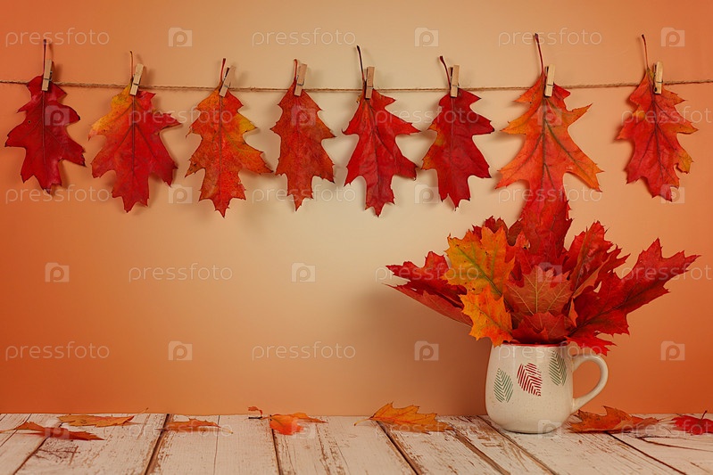 Пустая деревянная панель с кленовыми листьями на кухонном фоне, минималистская осенняя концепция, творческая осенняя композиция и баннер для отображения