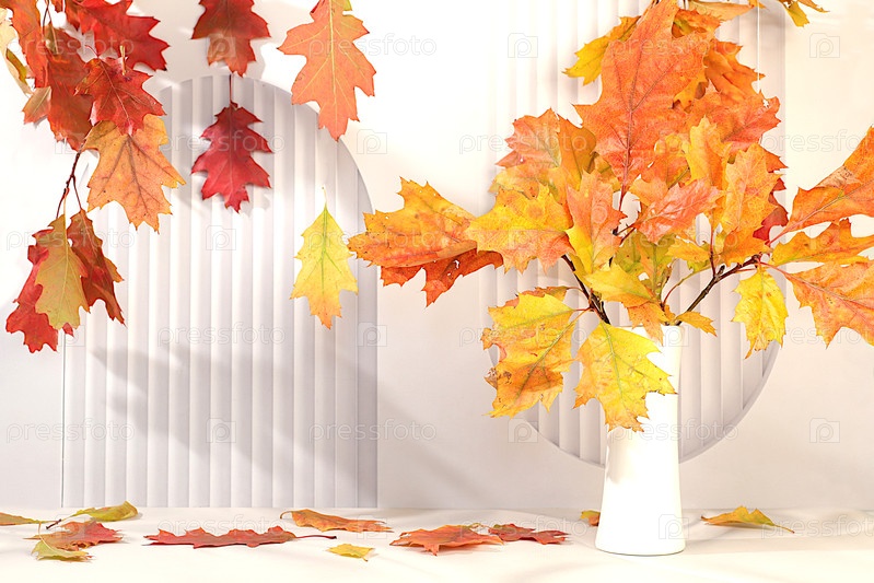 Творческая осенняя композиция и баннер для демонстрации. пустой современный элегантный кусок отображает стол с кленовыми листьями на кухонном фоне, минималистичная осенняя концепция. счастливая благодарственная открытка