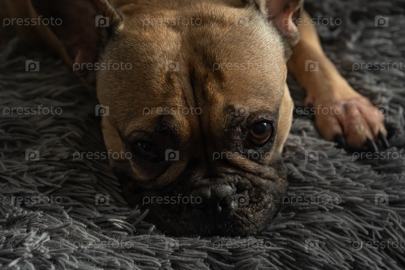 Французский бульдог отдыхает на плюшевом сером ковре, демонстрируя спокойное и спокойное поведение.Уютная обстановка подчеркивает расслабленное и спокойное состояние собак, захватывая их безмятежное выражение
