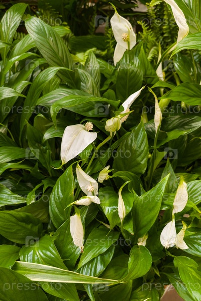 Мирное растение лилии, показывающее элегантные белые цветы среди ярко-зеленых листьев.Эта композиция подчеркивает естественную красоту растения, передавая ощущение спокойствия и свежести