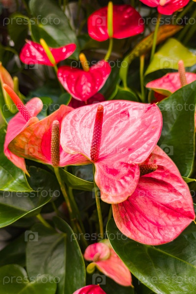 Цветы антуриака с их ярко-красными пятнами и пышными зелеными листьями создают яркий дисплей.Они выделяются своей уникальной формой и ярким цветом, добавляя тропический оттенок
