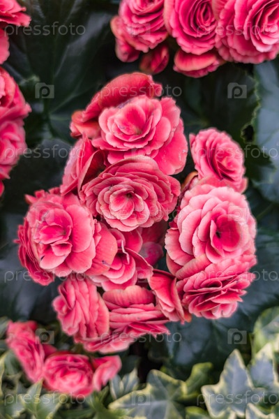 Правые розовые бегонии в полном цвете создают яркий и пышный дисплей на фоне темно-зеленых листьев