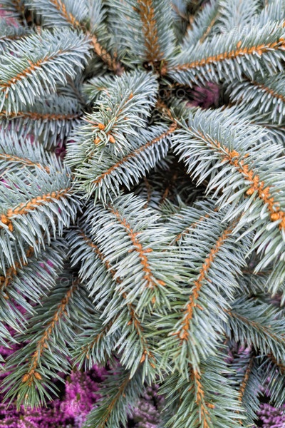 Густые ветви вечнозеленых деревьев создают естественный рисунок с ярко выделяющимися сине-зелёными иглами.Перспектива подчеркивает сложные текстуры и цвета хвойных деревьев в их естественной среде