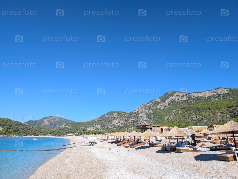 Стройные зонтики обеспечивают тень, в то время как пышно-зеленые горы образуют потрясающий фон под безоблачным небом